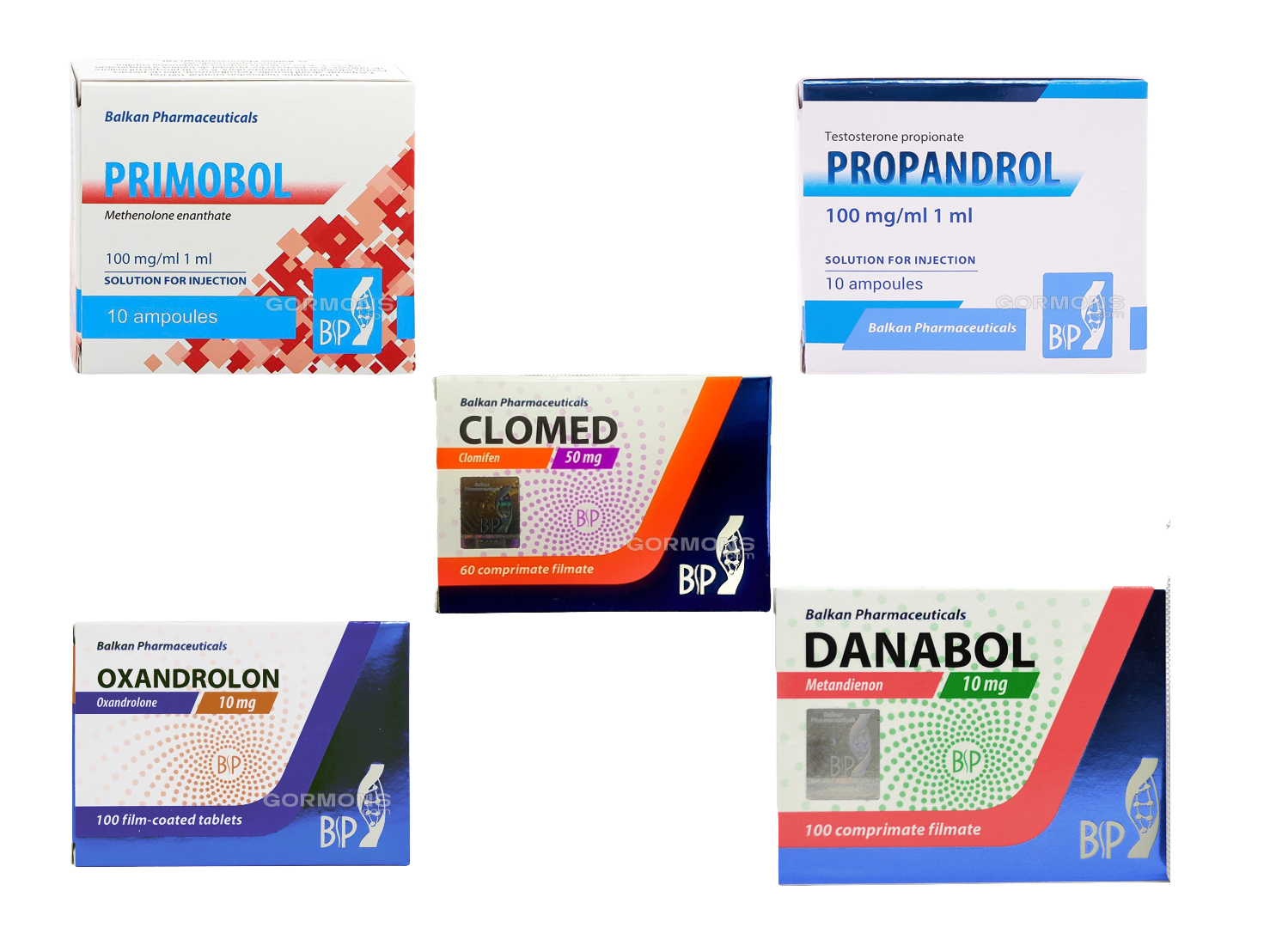 Препараты, входящие в курс: тестостерон пропионат (13 ампул), примоболан (24 ампулы), оксандролон (120 таб.), данабол (120 таб.), анастрозол, кломид (20 таб.)